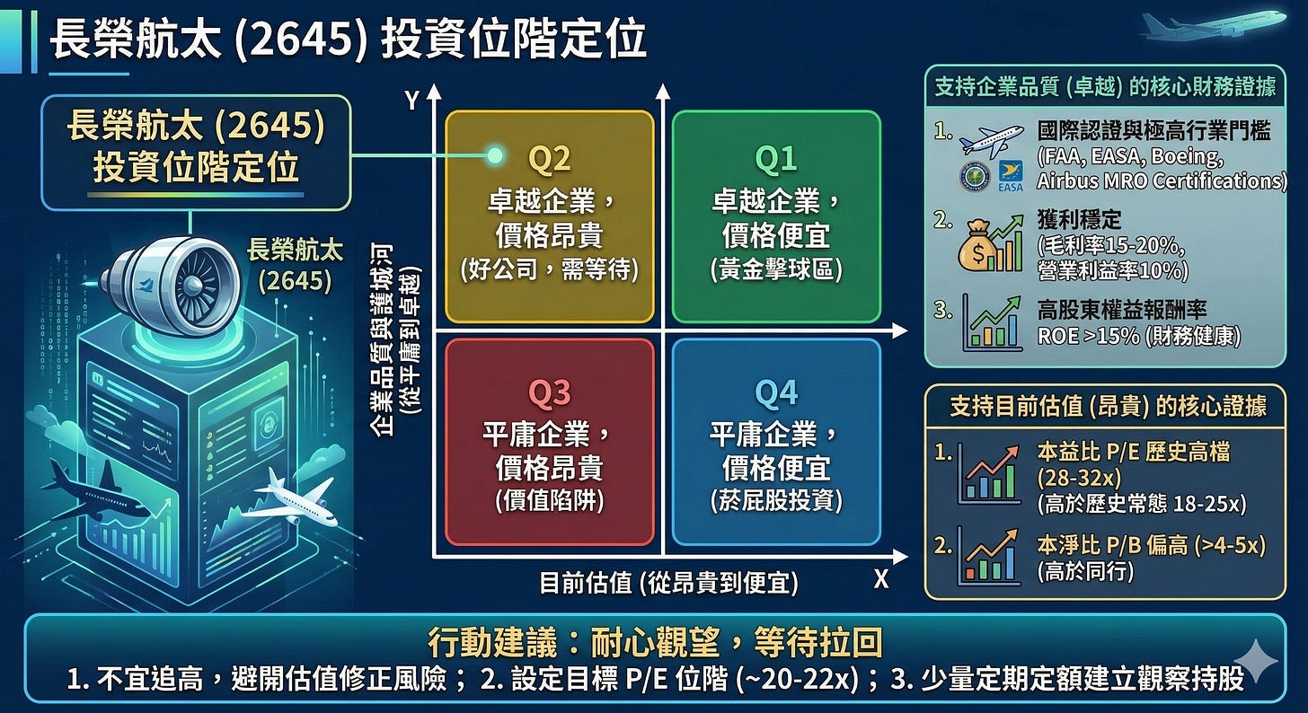綜合以上雷達圖的分析,我們將 X 軸設定為「目前估值(從昂貴到便宜)」,Y 軸設定為「企業品質與護城河(從平庸到卓越)」。長榮航太目前落在這四個象限中的哪一個呢?