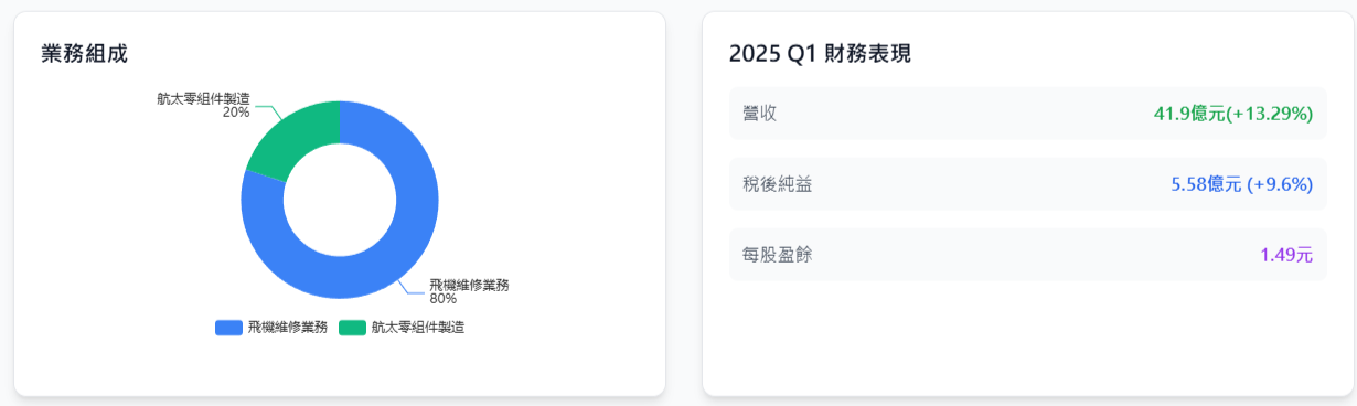 業務概況:長榮航太主要業務為飛機維修(佔營收約八成)及航太零組件製造(佔營收約二成)。公司看好商用機、國防及太空三大市場的成長潛力,並持續擴展業務,如與空中巴士簽訂合作合約成為一階供應商,並計劃擴建新廠房預計2027年開始出貨。