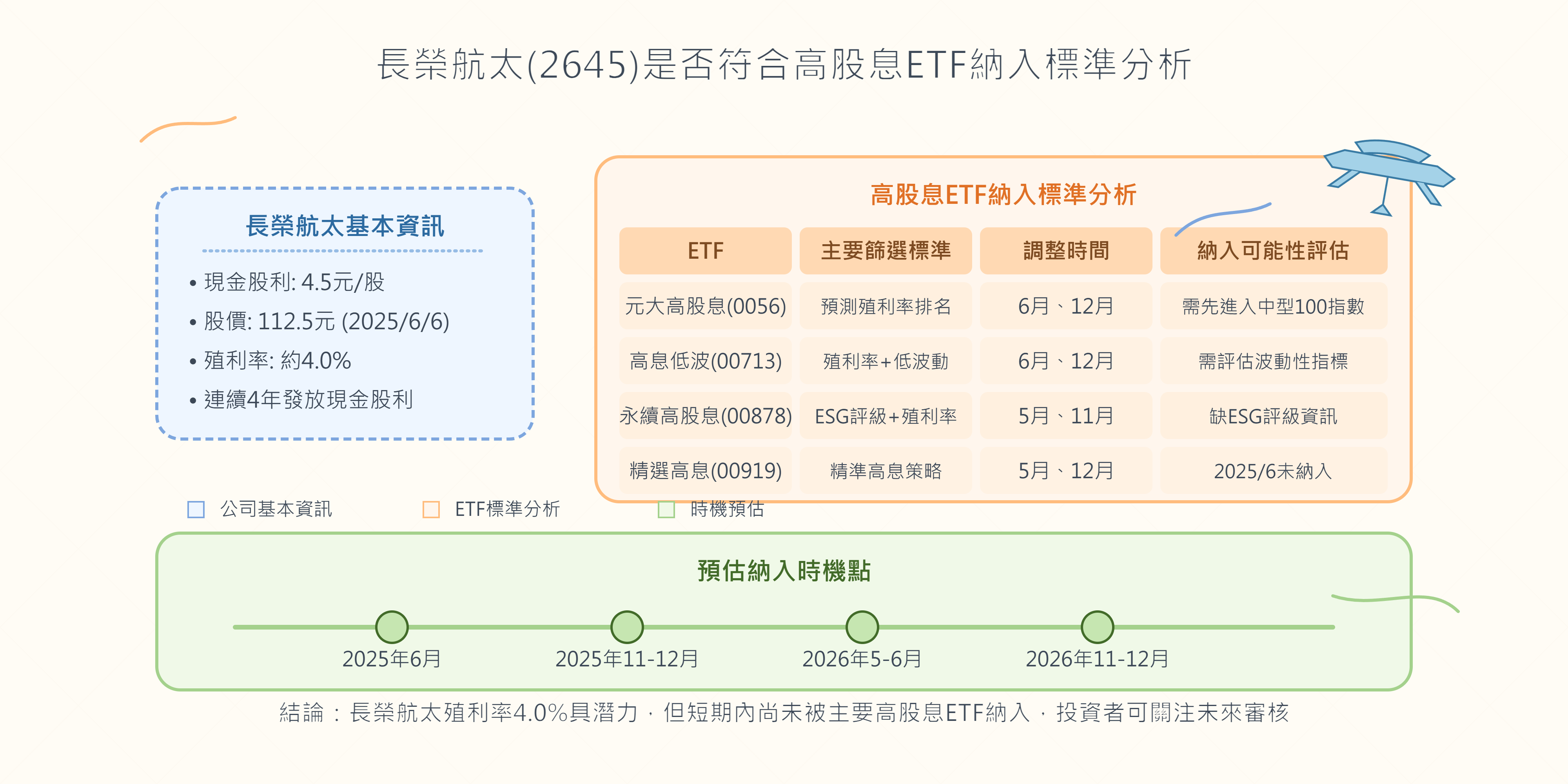 長榮航太 (2645) 以其穩定的業務基礎和持續的股利發放,具備成為高股息ETF成分股的潛力。然而,各ETF有其獨特的選股哲學與量化標準。