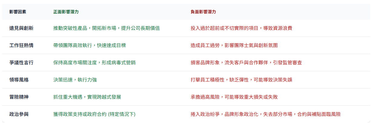 營運風險與不確定性:馬斯克的多線作戰和對非核心事務的投入,可能分散其對核心業務的注意力,增加營運風險。例如,他參與政治或管理X平台,都引發了對其是否能專注於特斯拉的質疑。