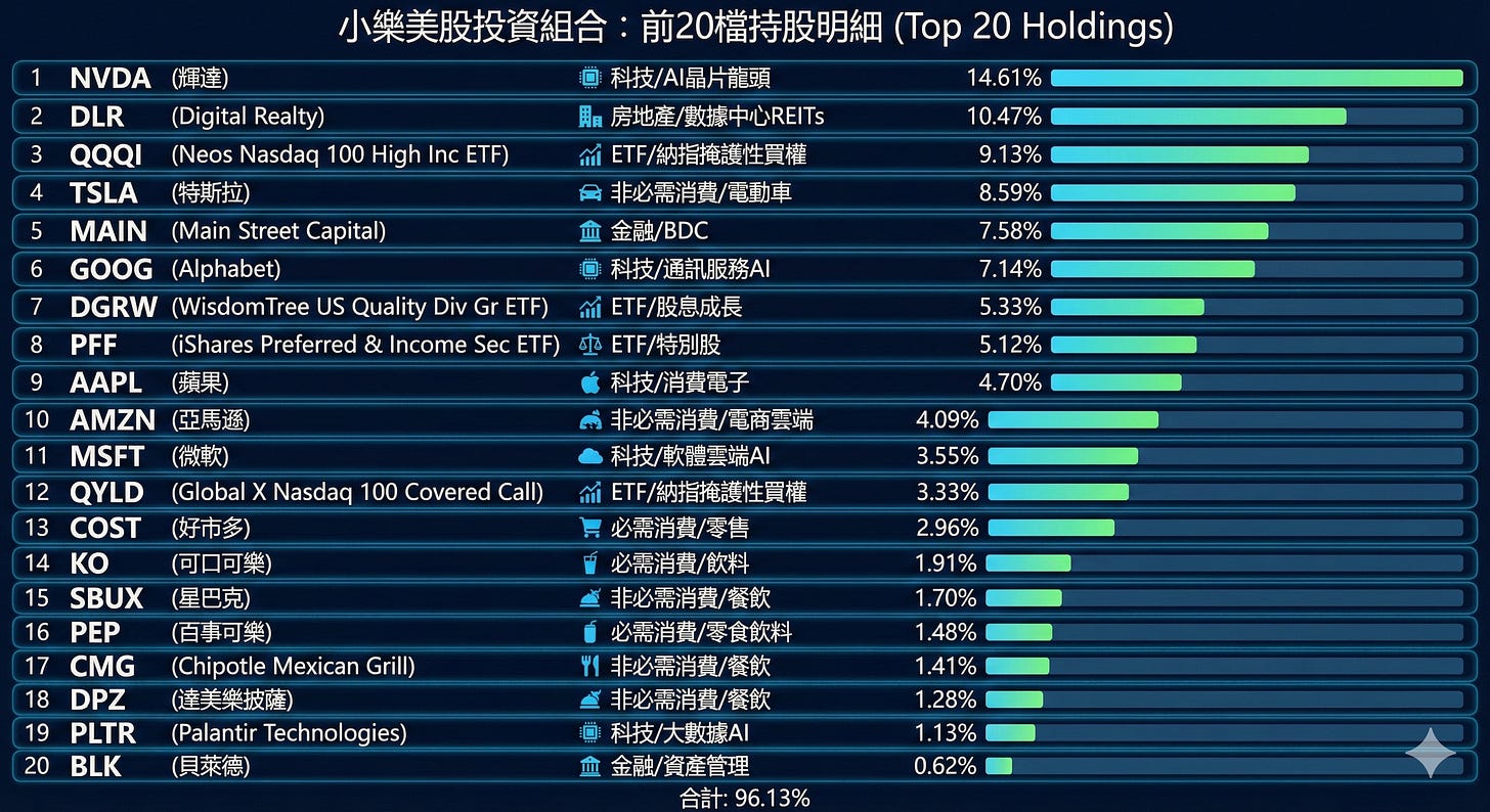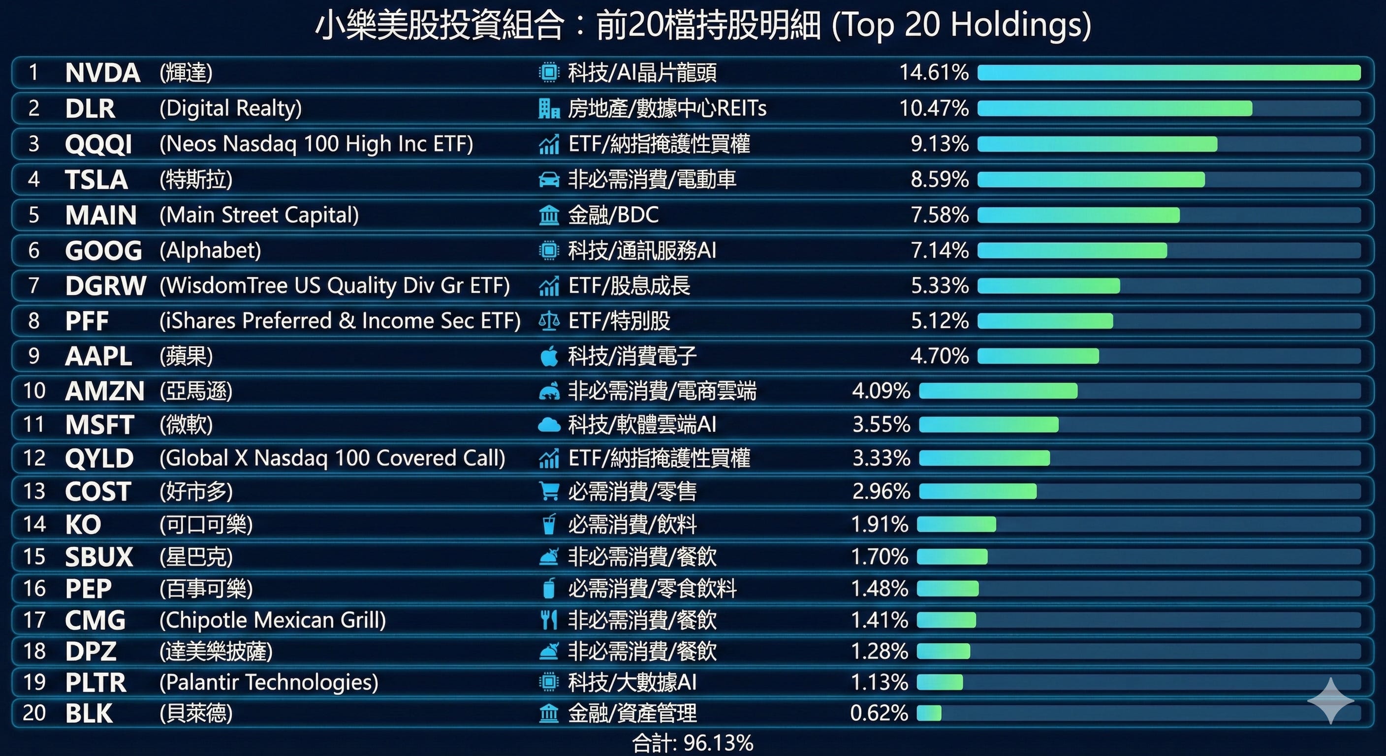 從產業板塊配置的角度觀察,透過直接持股 (NVDA, GOOG, MSFT, AAPL, PLTR) 和間接持有 (QQQI, QYLD, DLR, AMZN, TSLA),科技相關的曝險估計超過組合的 60%。