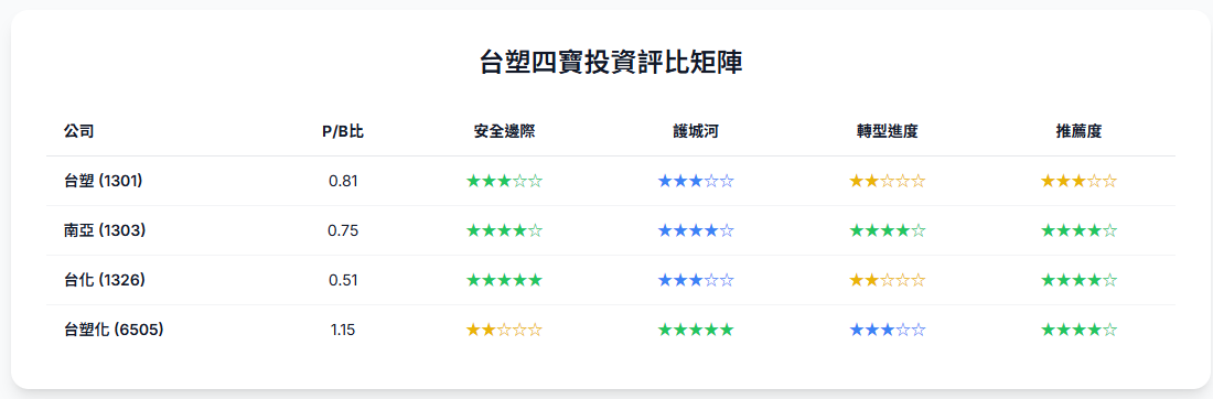 核心標的: 優先考慮安全邊際最高的台化 (1326),其股價淨值比最低,下檔風險相對有限。