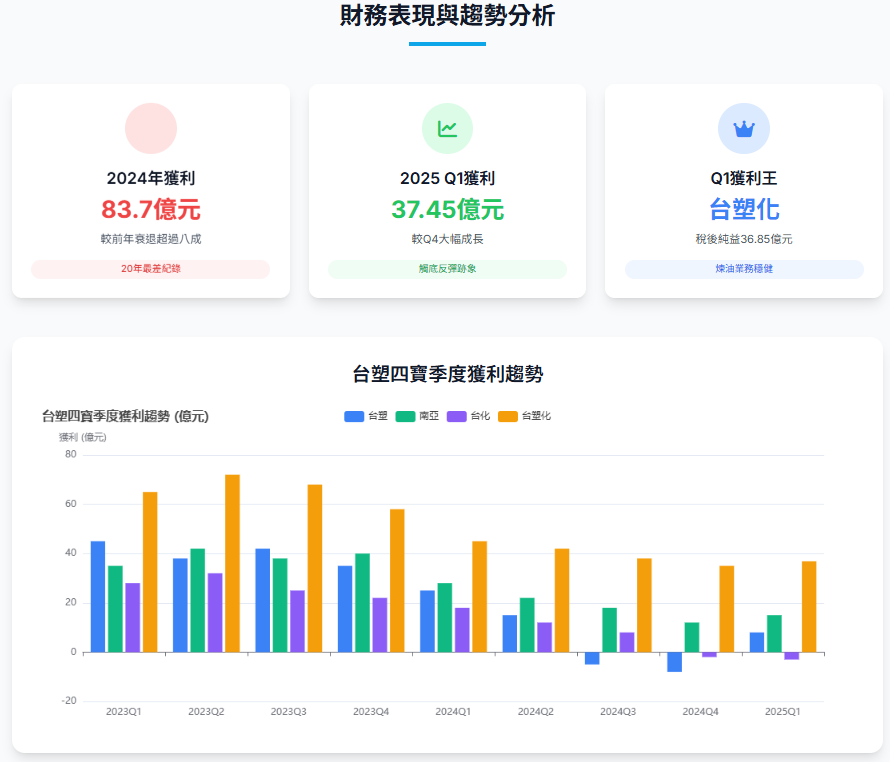 進入2025年第一季,營運出現觸底跡象。除台化仍小幅虧損外,其餘三寶均實現獲利,其中台塑化以稅後純益36.85億元成為獲利冠軍,帶動四寶單季合計獲利回升至37.45億元,較2024年第四季大幅成長。儘管如此,相較去年同期,整體獲利仍呈現衰退。