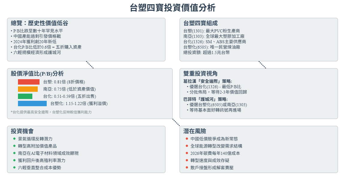 從葛拉漢的觀點來看,特別是台化,其股價淨值比已跌至歷史低位,意味著投資人能以極大的折價購入其廠房、土地、設備等實質資產,這為投資提供了強大的下檔保護。