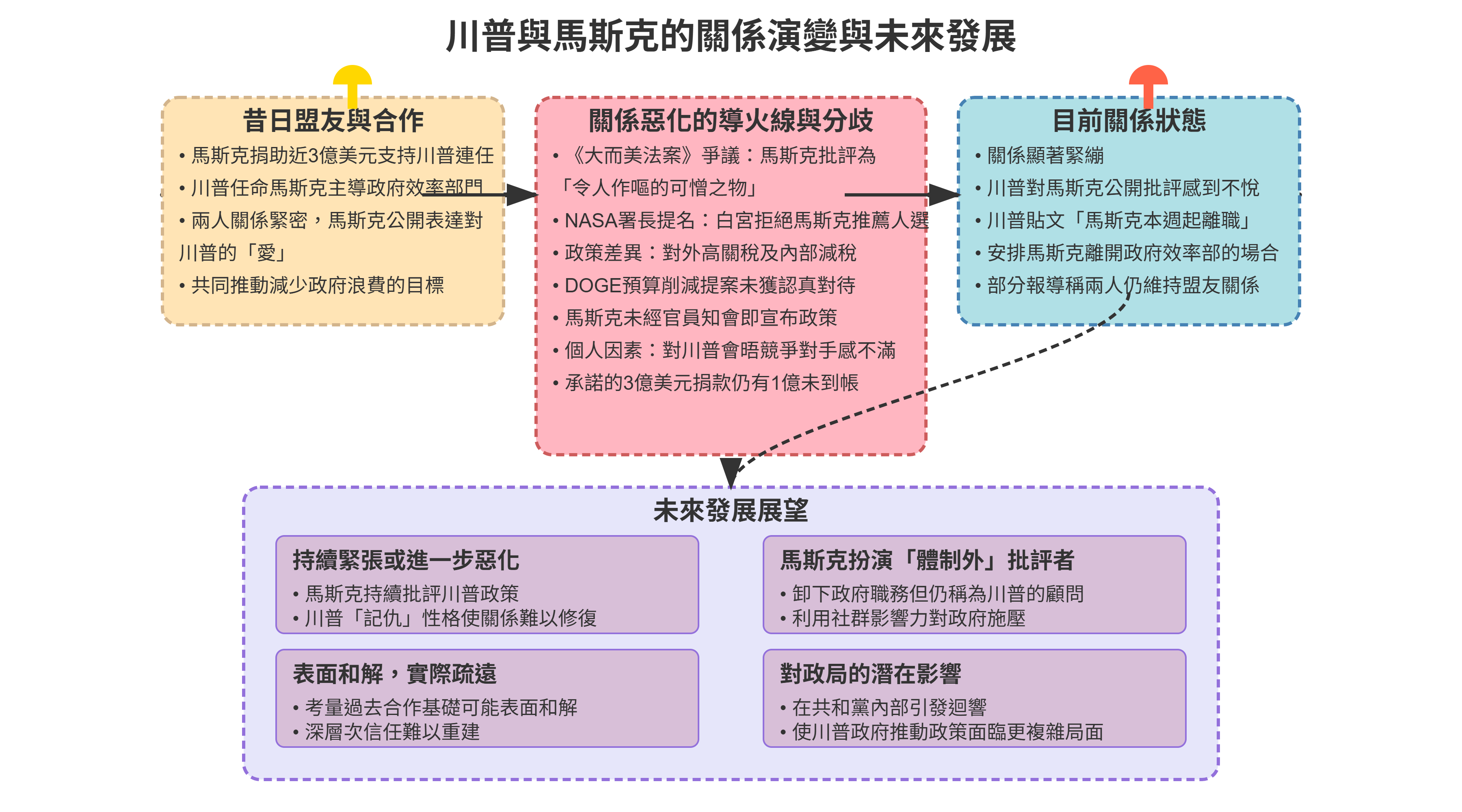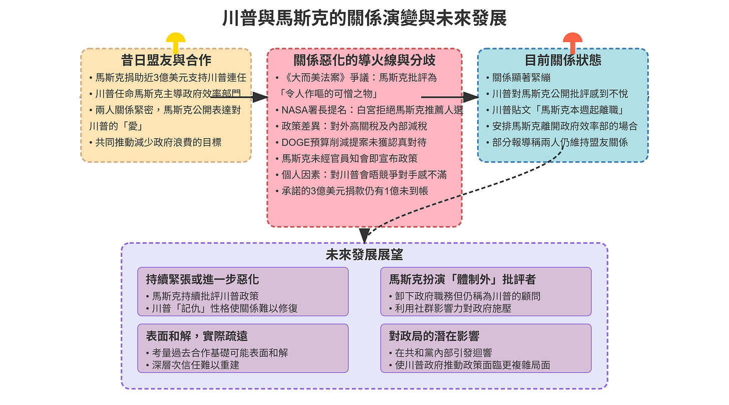 表面和解,實際疏遠:考量到雙方過去的合作基礎及馬斯克的影響力,不排除未來可能出現某種形式的表面和解。但鑑於目前的公開決裂,深層次的信任恐難重建。