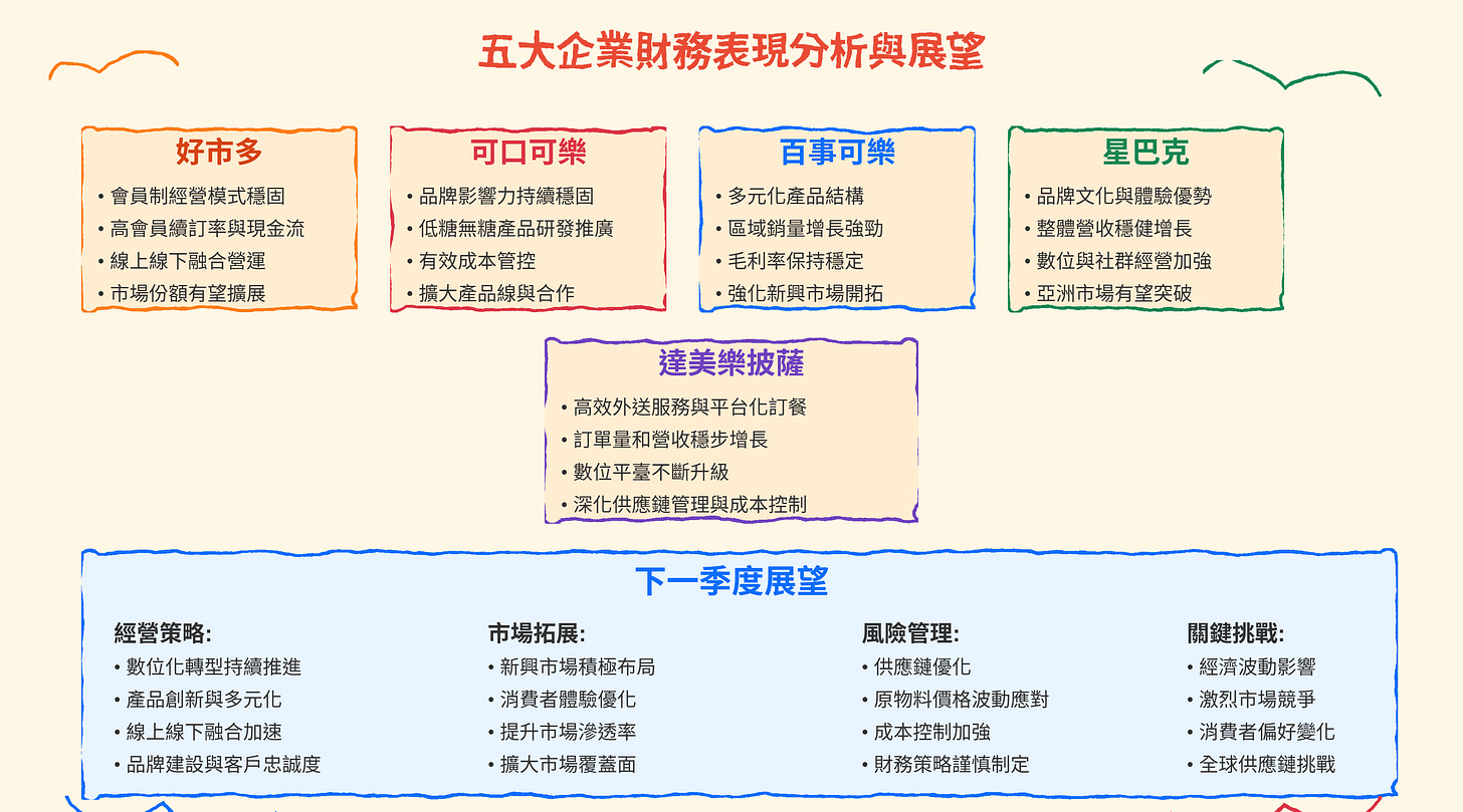 綜合來看,這五家公司的近期財務表現均各具特點,同時也面臨外部環境及內部調整帶來的挑戰。例如,好市多憑藉穩固會員基礎與線上線下融合營運持續發力;可口可樂與百事可樂則在產品創新與多元化策略中尋求突破;星巴克則通過品牌效應與技術創新改善消費體驗;而達美樂披薩則利用高效的外送服務與數字化轉型迅速應對市場變數。
