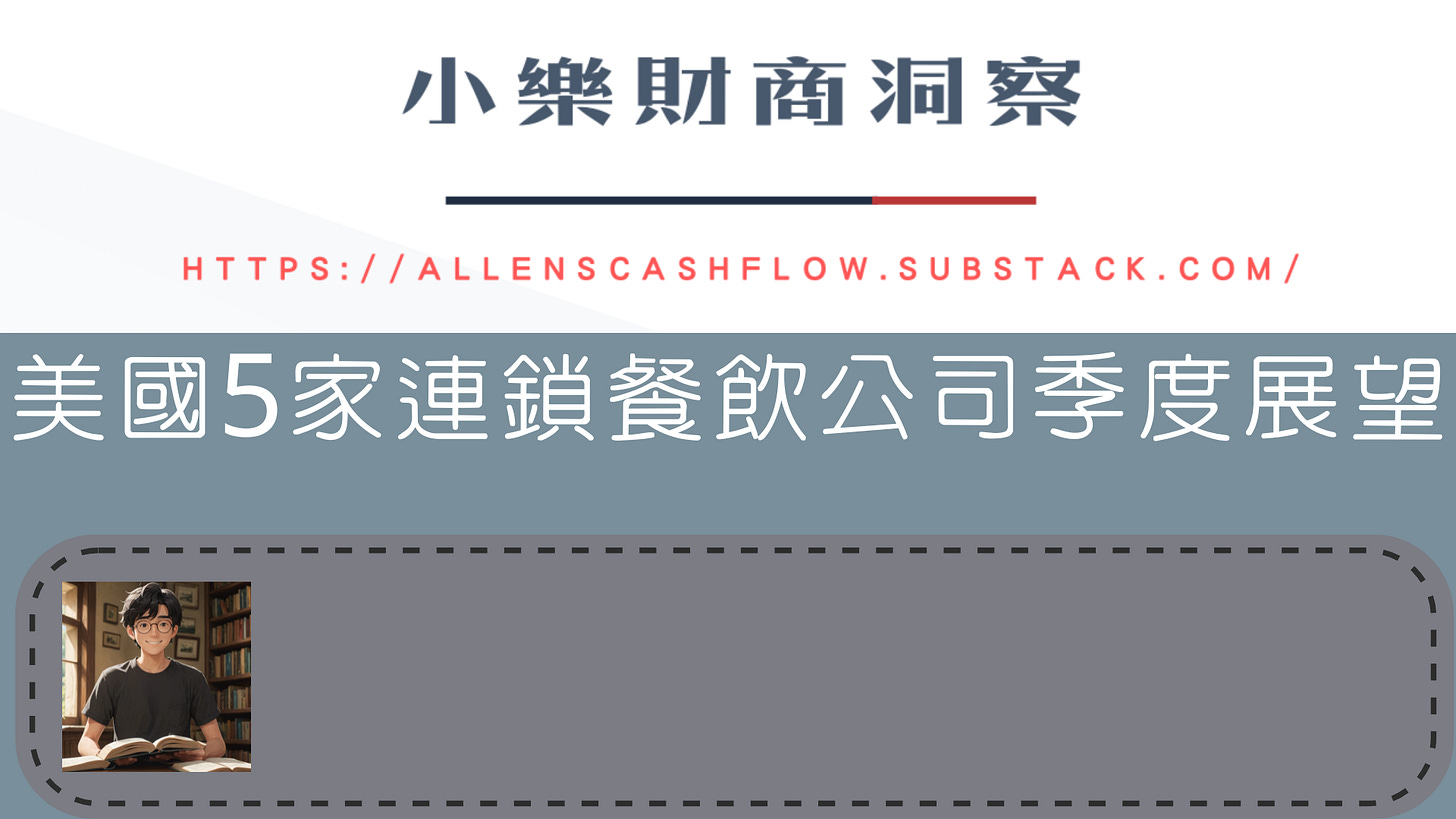 大家好,歡迎來到小樂財商洞察YT頻道,請訂閱並打開小鈴鐺,就能收到我們製作的最新影片。今天我們要跟大家分享的是美國5家連鎖餐飲公司的季度展望: