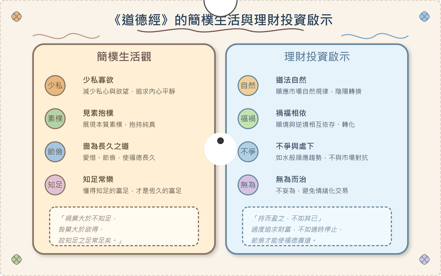 總體而言,《道德經》為現代人在紛繁複雜的社會中,提供了一種返璞歸真、順應自然的生活與理財哲學。透過理解並實踐其中的智慧,有助於建立內心的平靜,並在財富管理上做出更明智的決策。