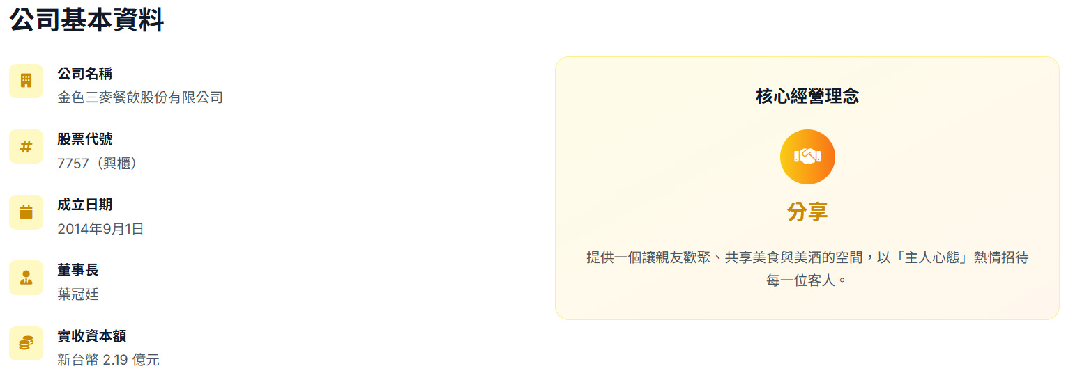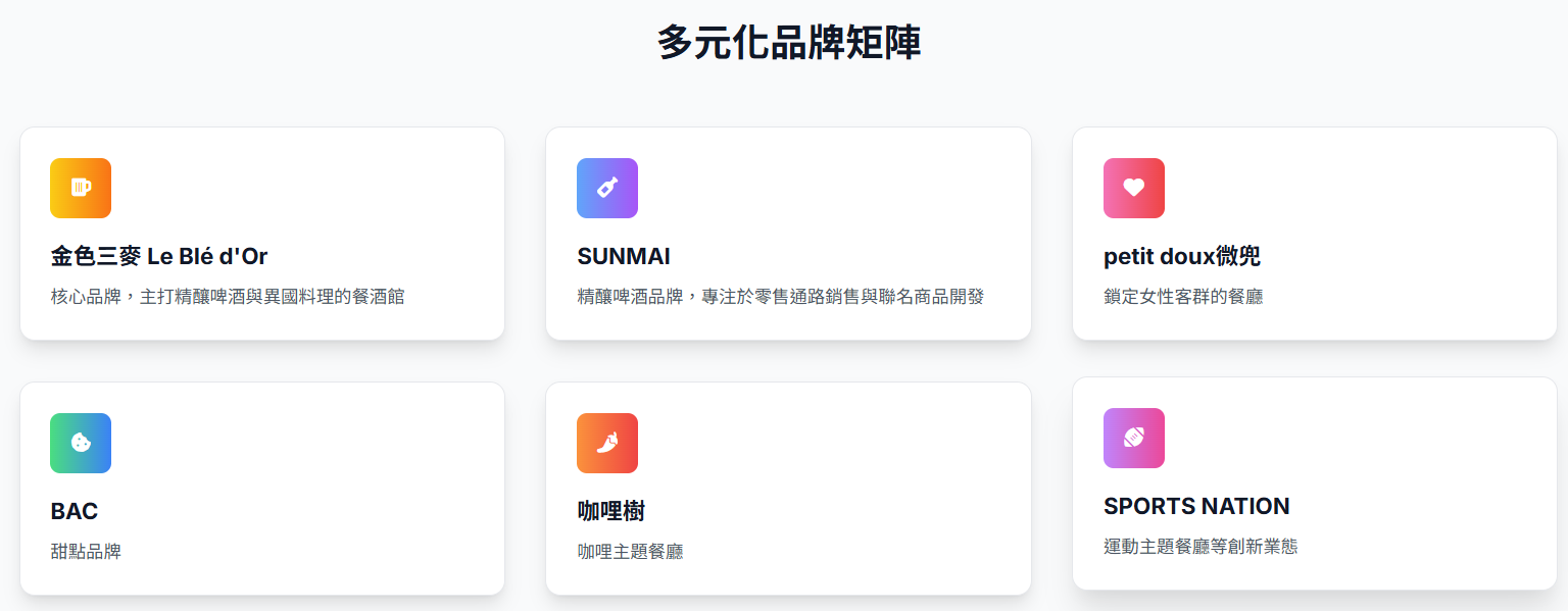 旗下擁有多元品牌,包括「金色三麥」、「SUNMAI」、「微兜」、「SPORTS NATION」等十個直營品牌,涵蓋精釀啤酒釀造、餐廳經營及各式飲品銷售,已於2024年6月登錄興櫃,股票代號7757。