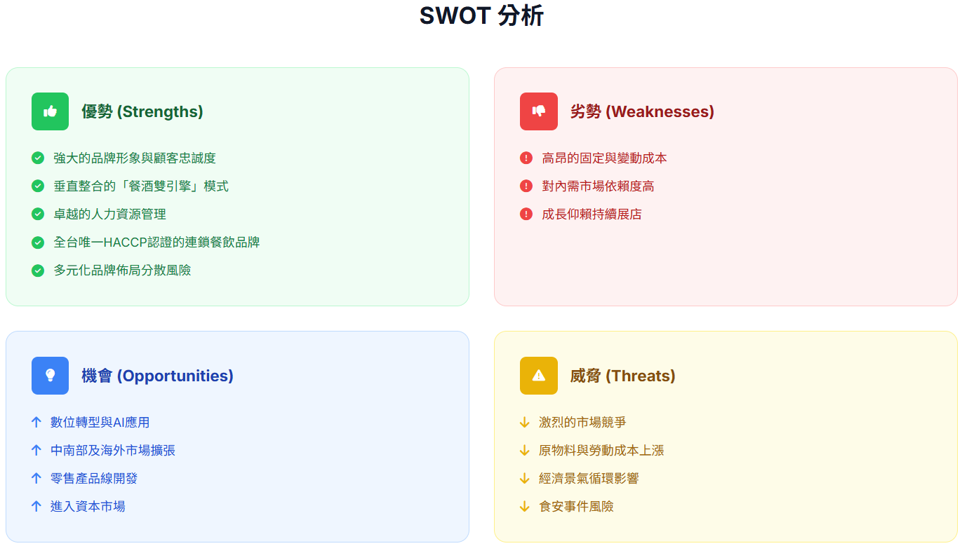 威脅 (Threats):餐飲市場競爭激烈,國內外品牌眾多;原物料及勞動成本上漲壓縮獲利空間;經濟景氣循環與不可預期的食安事件風險。