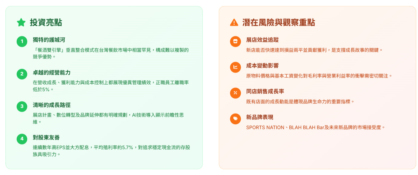 金色三麥展現了穩健經營、積極創新的特質,是內需市場中具備長期投資價值的公司。其「餐酒雙引擎」的獨特商業模式、卓越的員工管理、前瞻性的數位轉型策略,以及對股東友善的配息政策,都是其吸引投資人的亮點。投資人應持續關注其展店效益、成本控制能力,以及新品牌的市場接受度,並可考慮在合理價位納入投資組合,參與其未來的成長。