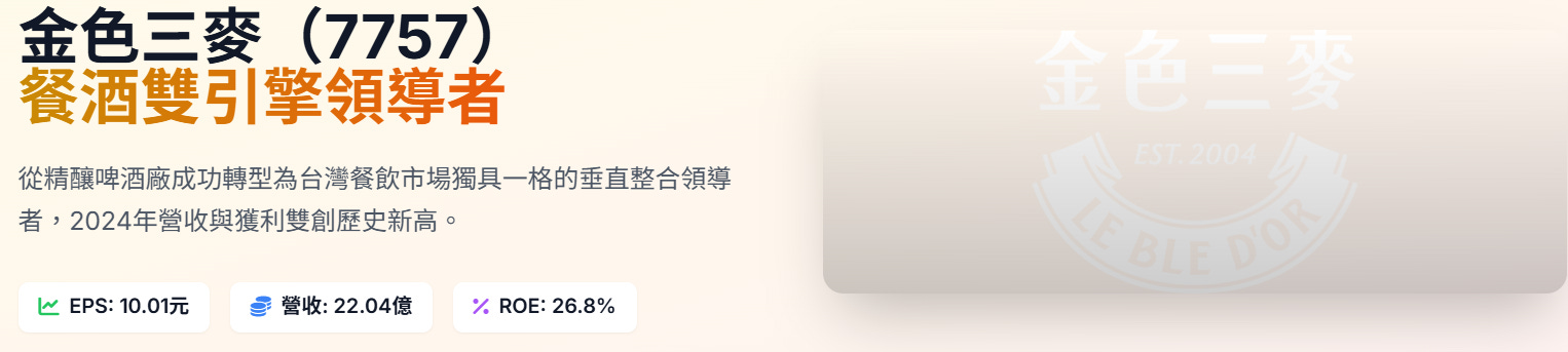 金色三麥(7757)已成功從精釀啤酒廠轉型為台灣「餐酒雙引擎」的領導品牌,近年營收與獲利表現亮眼,備受市場關注。