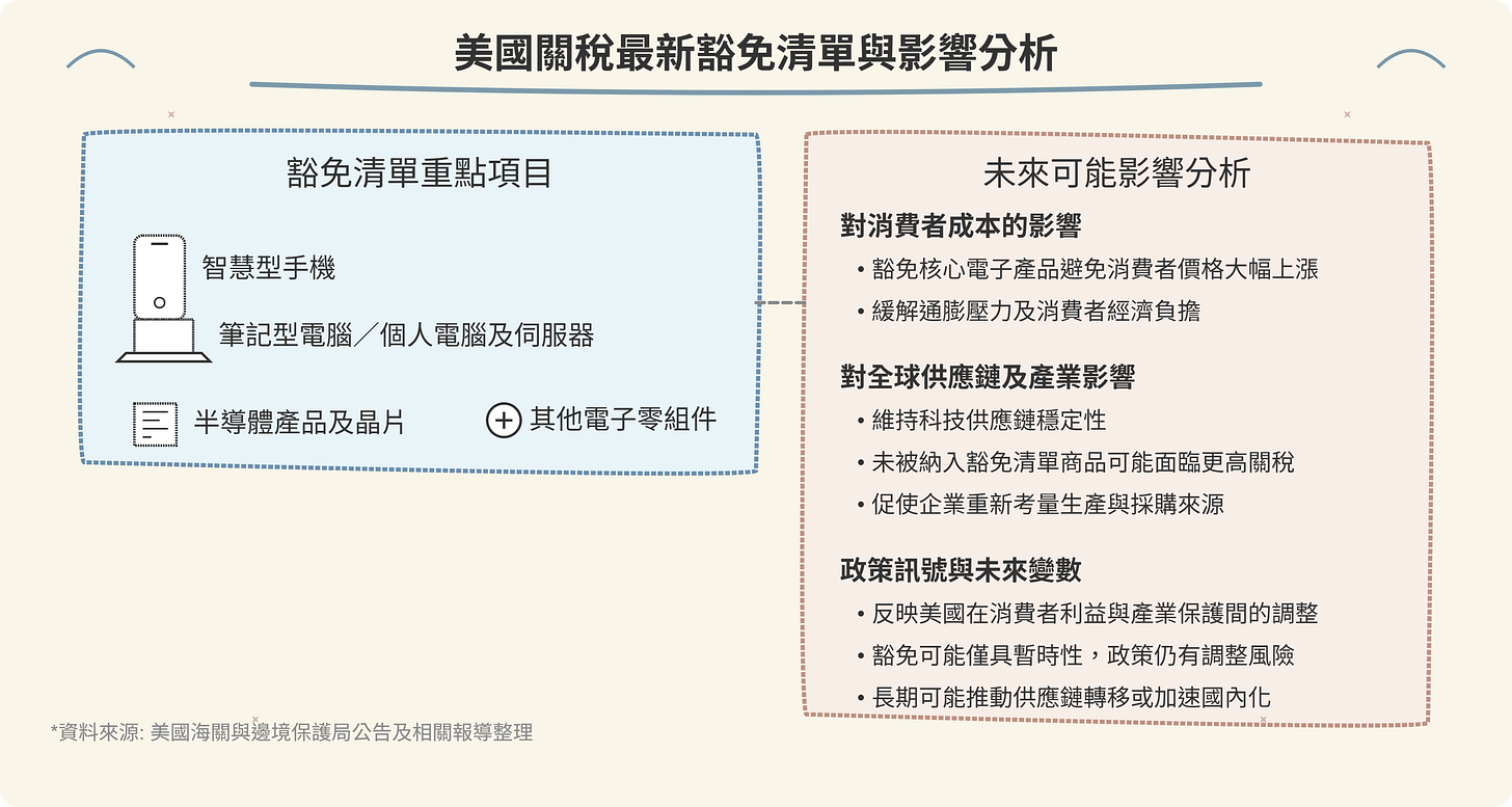 不過,部分報導也指出,這樣的豁免可能僅具有暫時性,未來針對半導體和其他核心科技產品的關稅政策仍有進一步調整的風險,市場參與者需留意隨後可能發布的新指引或進一步措施。