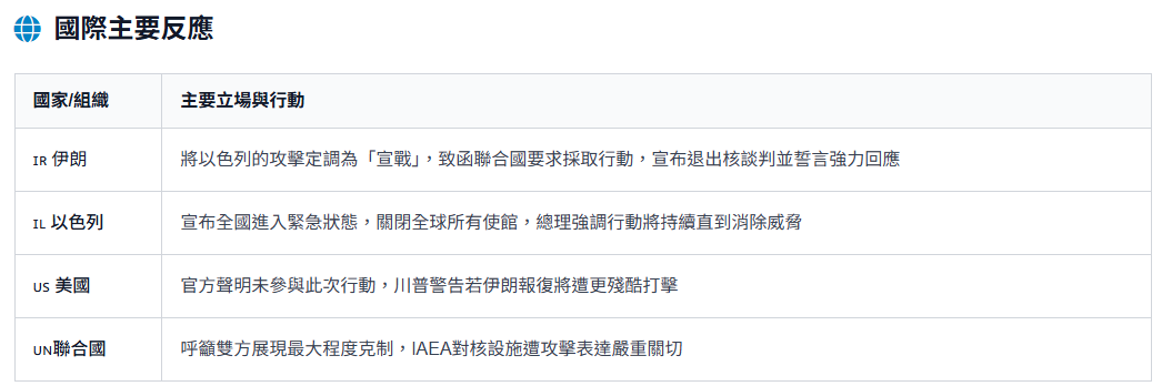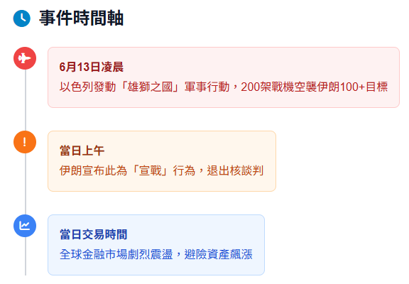 2025年6月13日,以色列對伊朗境內多個目標發動大規模空襲,目標直指其核設施與軍事據點,此舉無疑是中東長年緊張局勢的一次重大升級 。伊朗隨即將此攻擊定調為「宣戰」,並宣布退出與美國的核談判,導致地緣政治風險急遽升溫 。