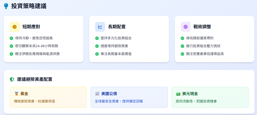 總而言之,面對地緣政治風險,投資人應採取「戰略上藐視,戰術上重視」的態度。保持長期的戰略定力,堅守資產配置紀律;同時在戰術上保持靈活性,利用避險工具管理風險,並在危機中尋找轉機。