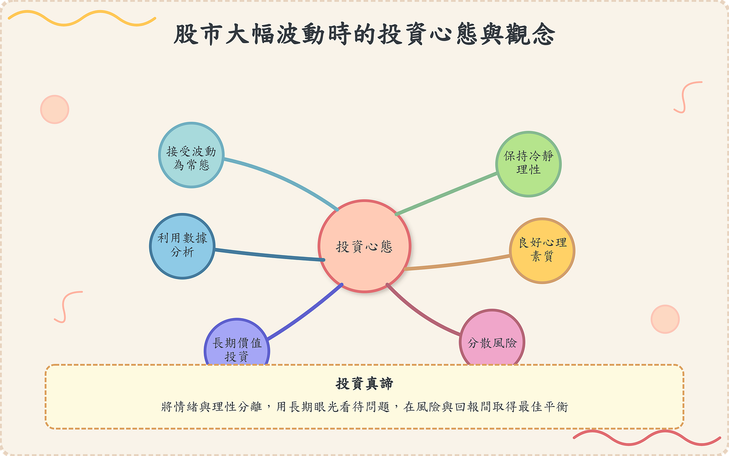 在股市大幅波動的時候,投資人若要在這樣極端的市場環境中保持穩定,除了需要掌握基本的投資知識外,更關鍵的是建立正確的投資觀念與心理素質。我們將探討面對市場劇烈波動時,投資人應具備哪些心態與觀念,並從風險管理、情緒控制、長期投資思維等角度進行剖析,協助投資人制訂出一套應對策略。