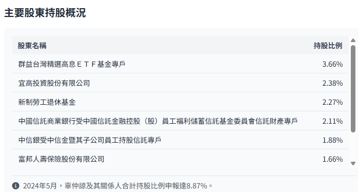 大股東持股揭露 (2024年5月): 因應證交法新規,公告大股東辜仲諒及其關係人合計持有中信金股權達8.87%,引發市場關注其未來在公司的角色。