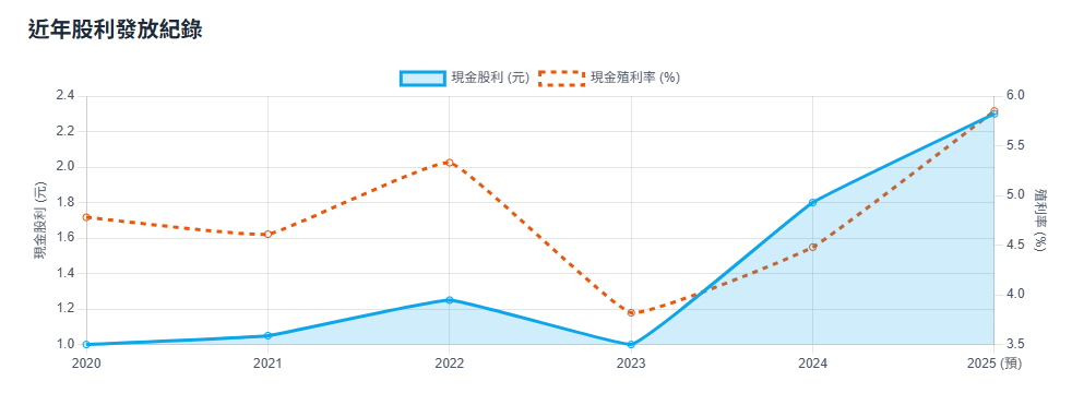 殖利率: 以2025年預計配息2.3元計算,現金殖利率約5.85%。