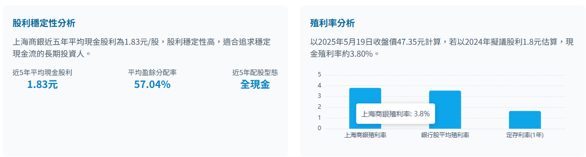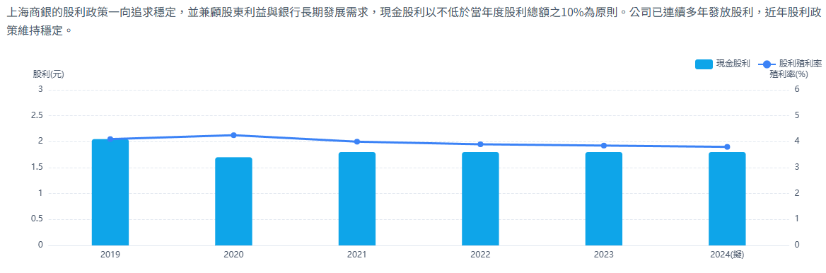 上海商銀有著長期且穩定的股利發放記錄。根據公司網站資料,其股利政策旨在兼顧股東利益、平衡股利,並配合銀行的資金需求及長期財務規劃。現金股利以不低於當年度股利總額之百分之十為原則 。