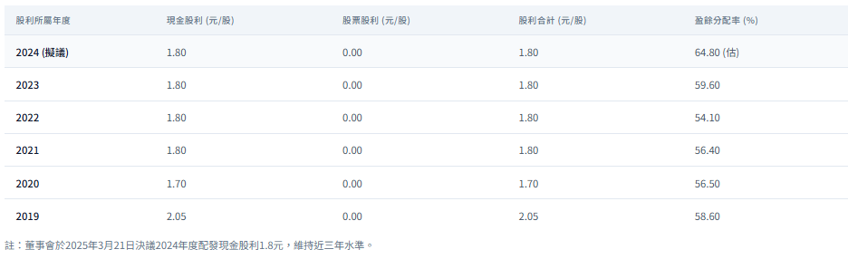 資料顯示公司已連續15年發放股利,合計28.13元,近5年平均現金殖利率約3.90% 。