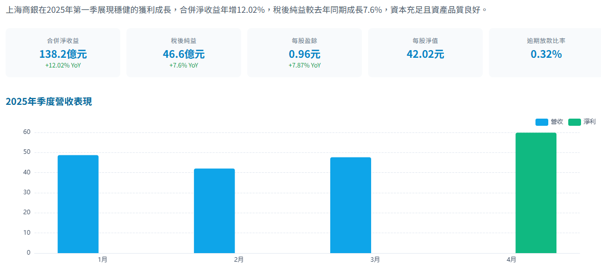 上海商銀2025年第一季表現亮眼,合併淨收益達138.2億元,年增12.02%;稅後淨利歸屬母公司業主46.6億元,年增7.67%;EPS為0.96元 。利息淨收益年增1.96%,手續費淨收益年增19.27%,顯示核心業務動能持續 。個體普通股權益比率CET1為12.84%,資本適足率為16.03%,資本結構穩健 。