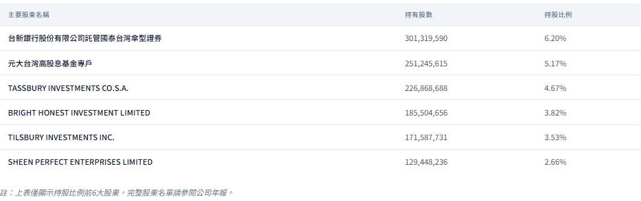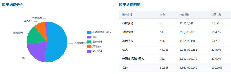 股權結構方面,外國機構及外國人持股比例最高,超過五成 。