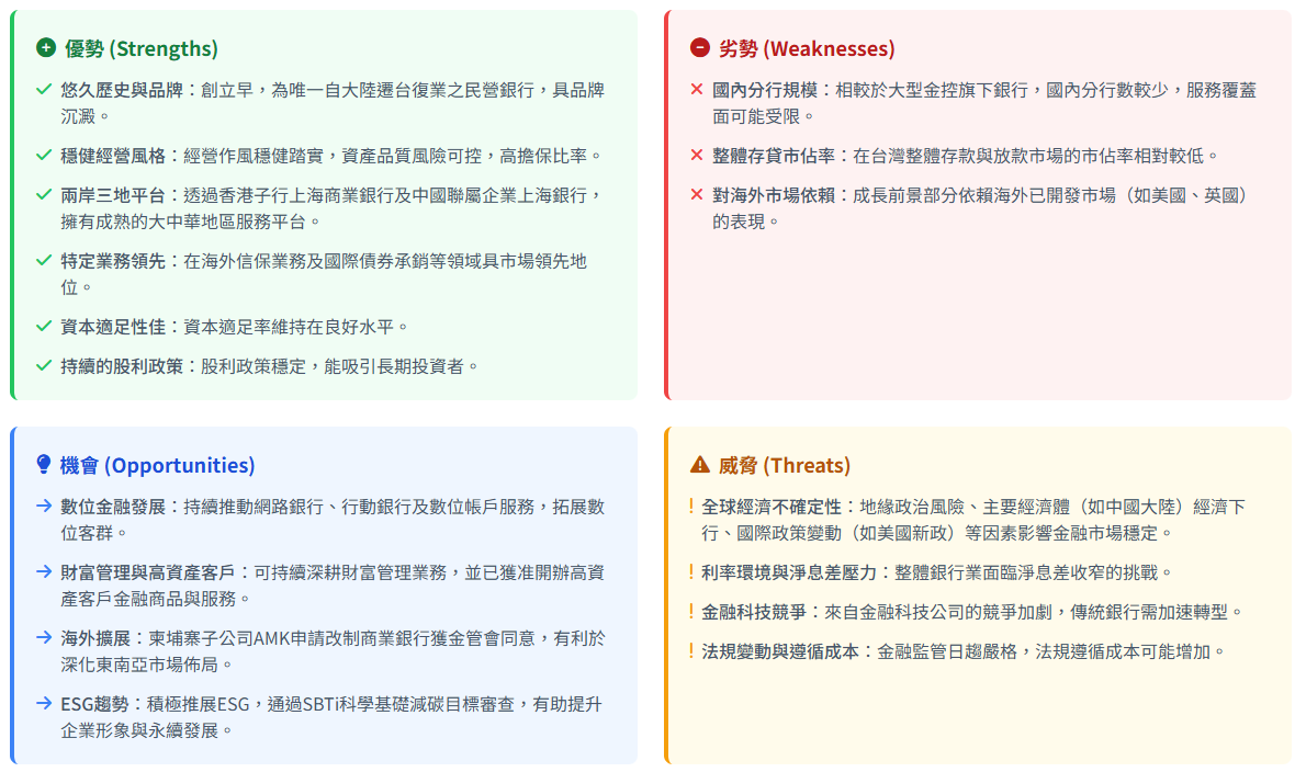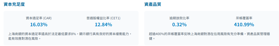 儘管面臨地緣政治風險、中國大陸經濟下行及美國政策不確定性等外部挑戰,上海商銀憑藉其審慎的經營策略、充足的資本適足率及在永續發展方面的努力,預期將持續穩健發展。