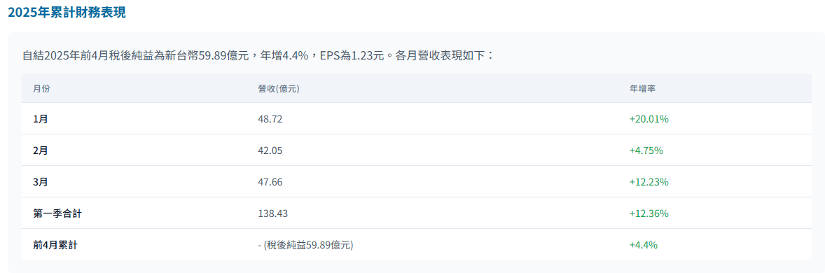 2025年第一季,公司實現了亮眼的財務表現,合併淨收益與稅後淨利均錄得雙位數增長,每股盈餘(EPS)達到0.96元,優於去年同期 。