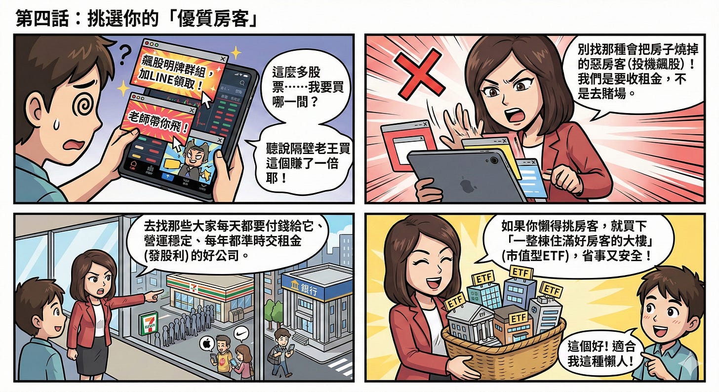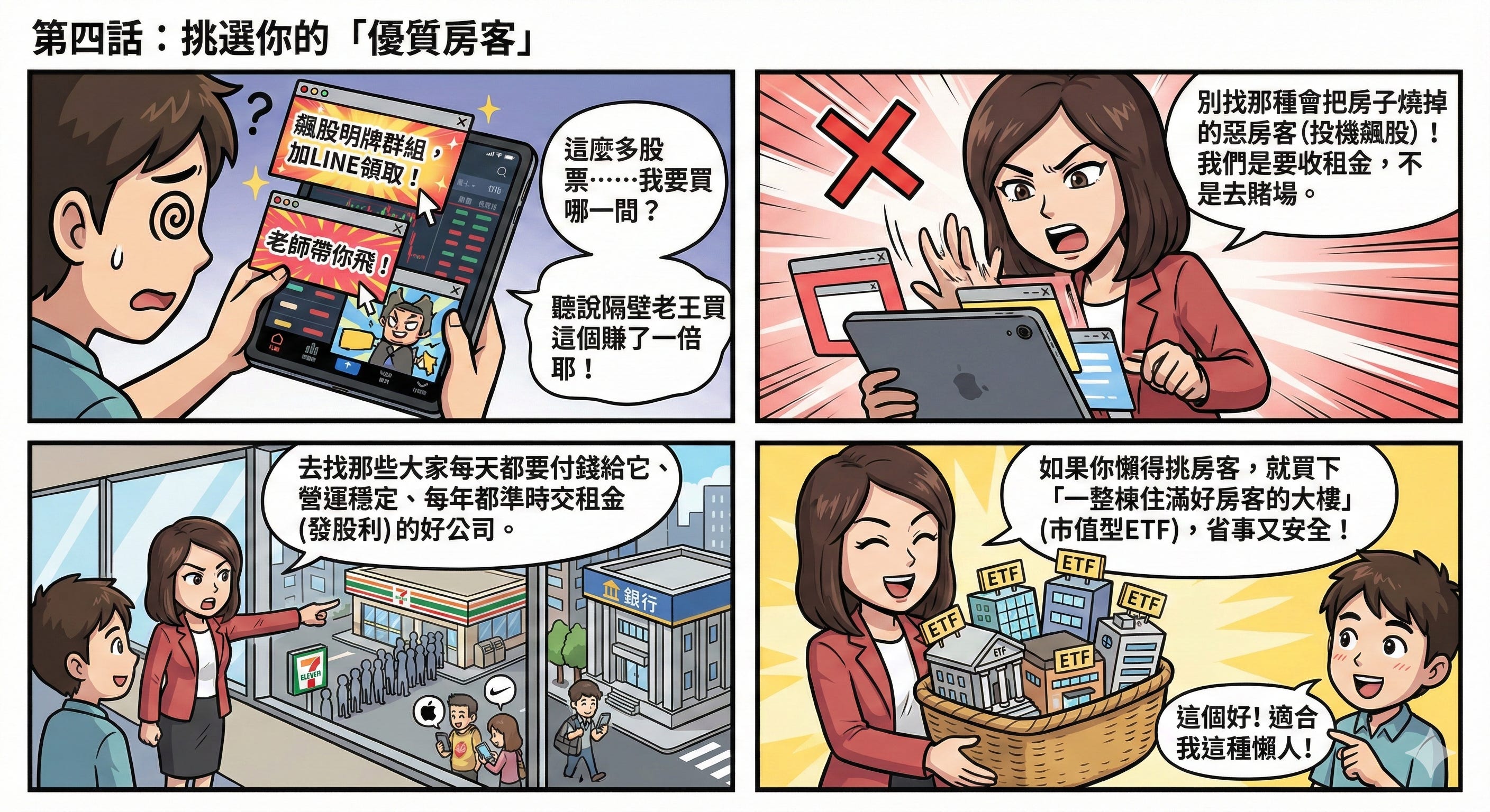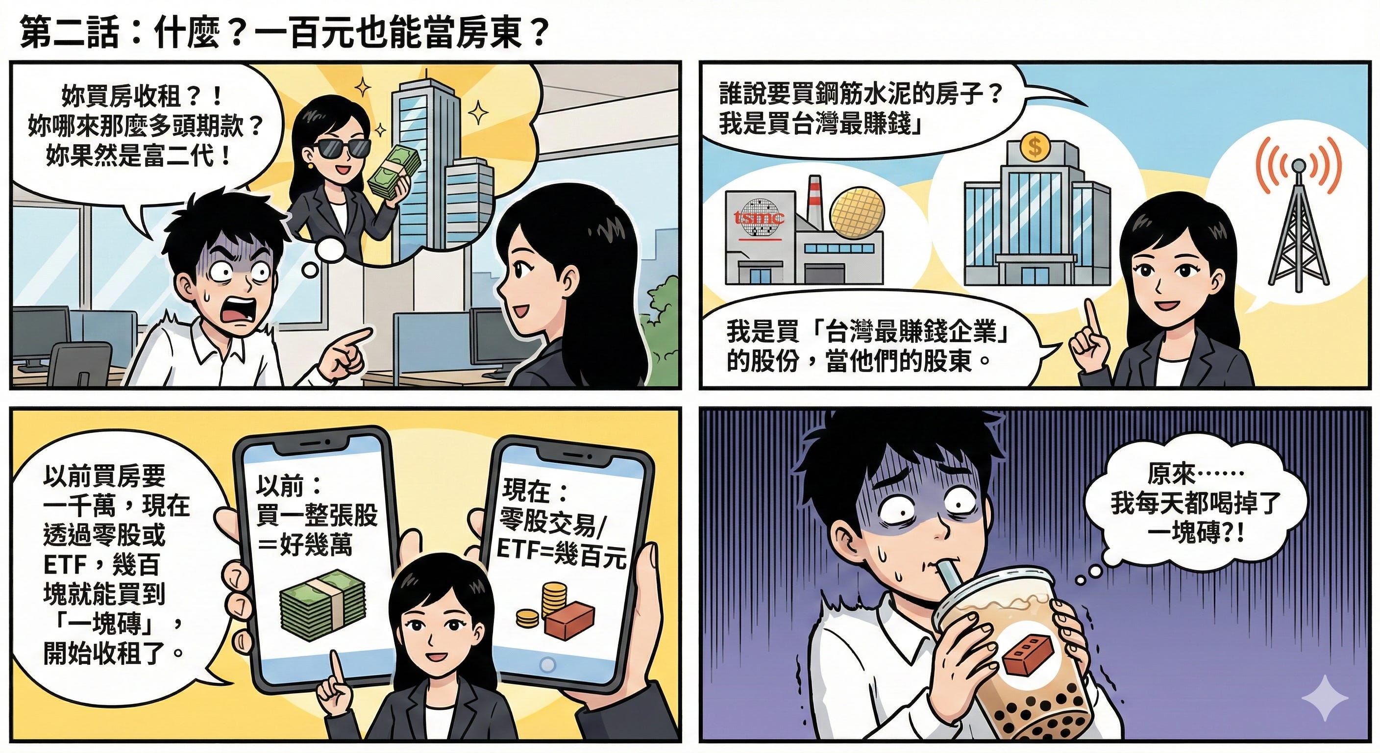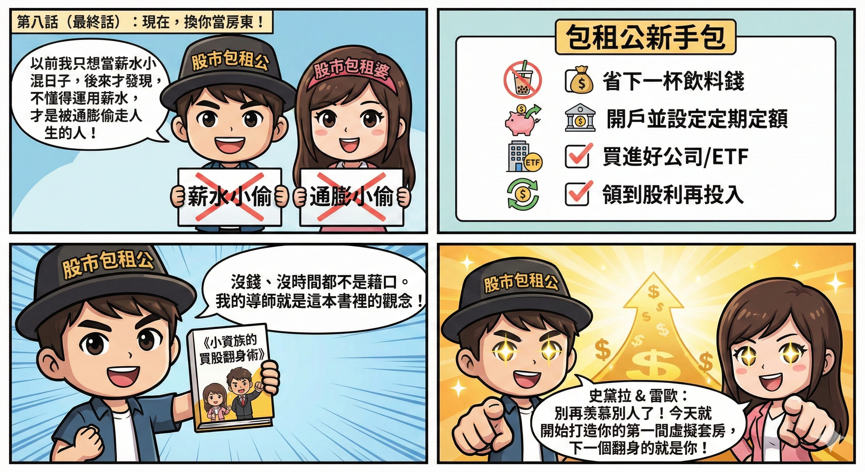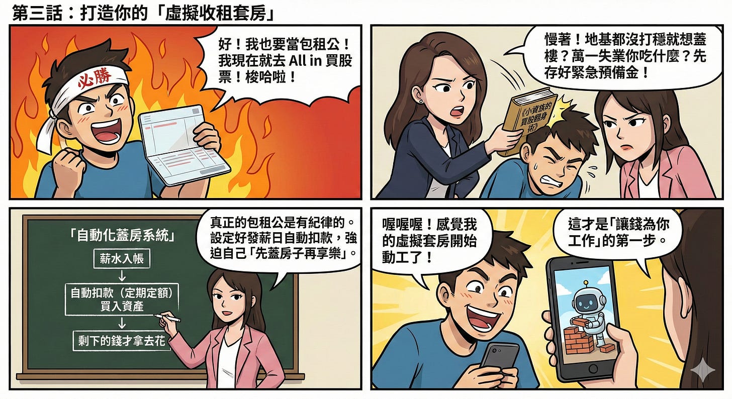 投資觀念四格漫畫(內容:小資族的買股翻身術/AI生成)