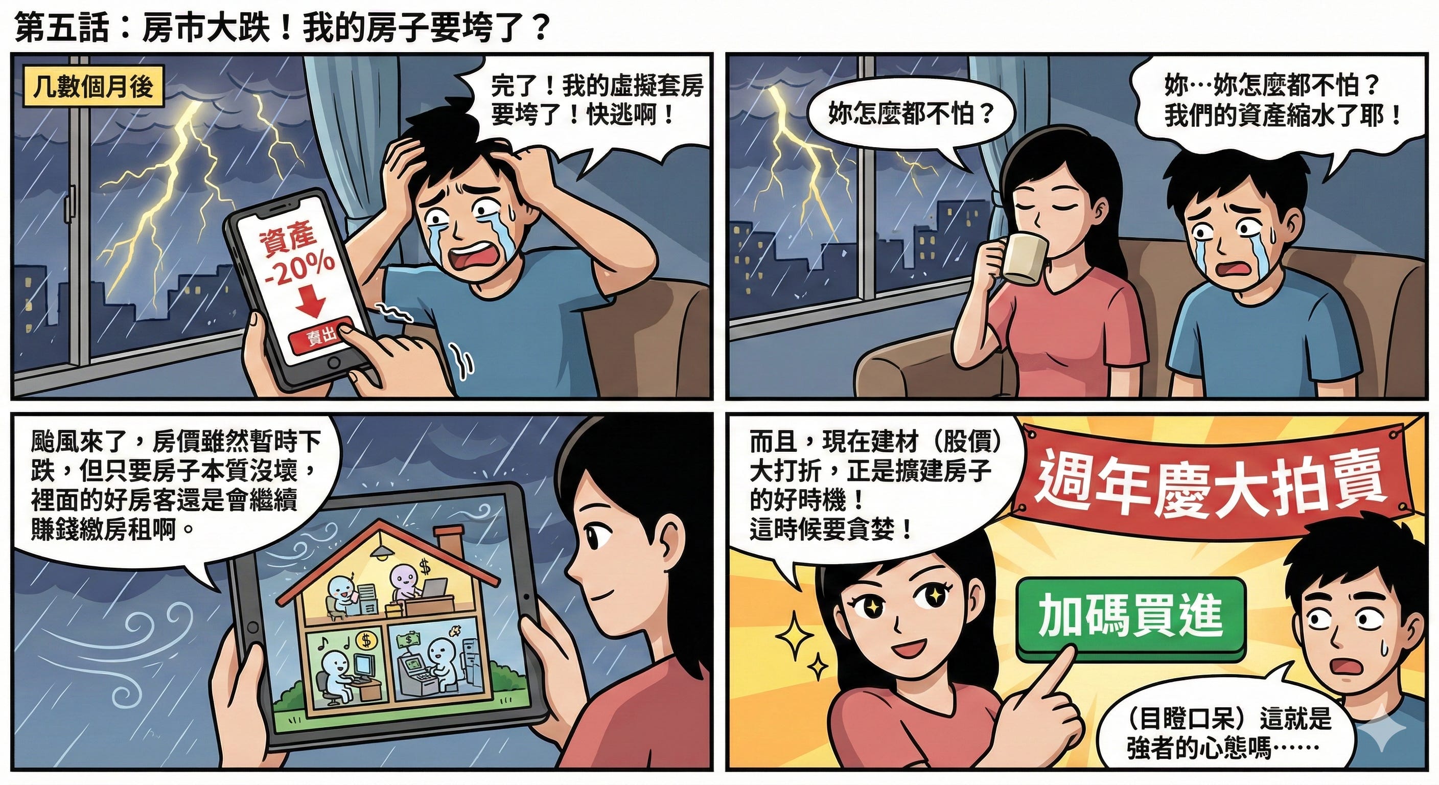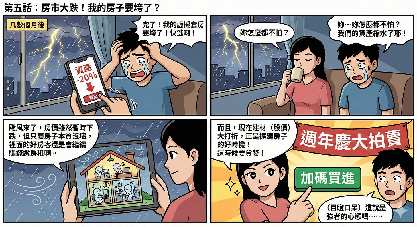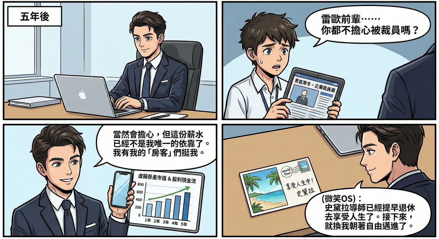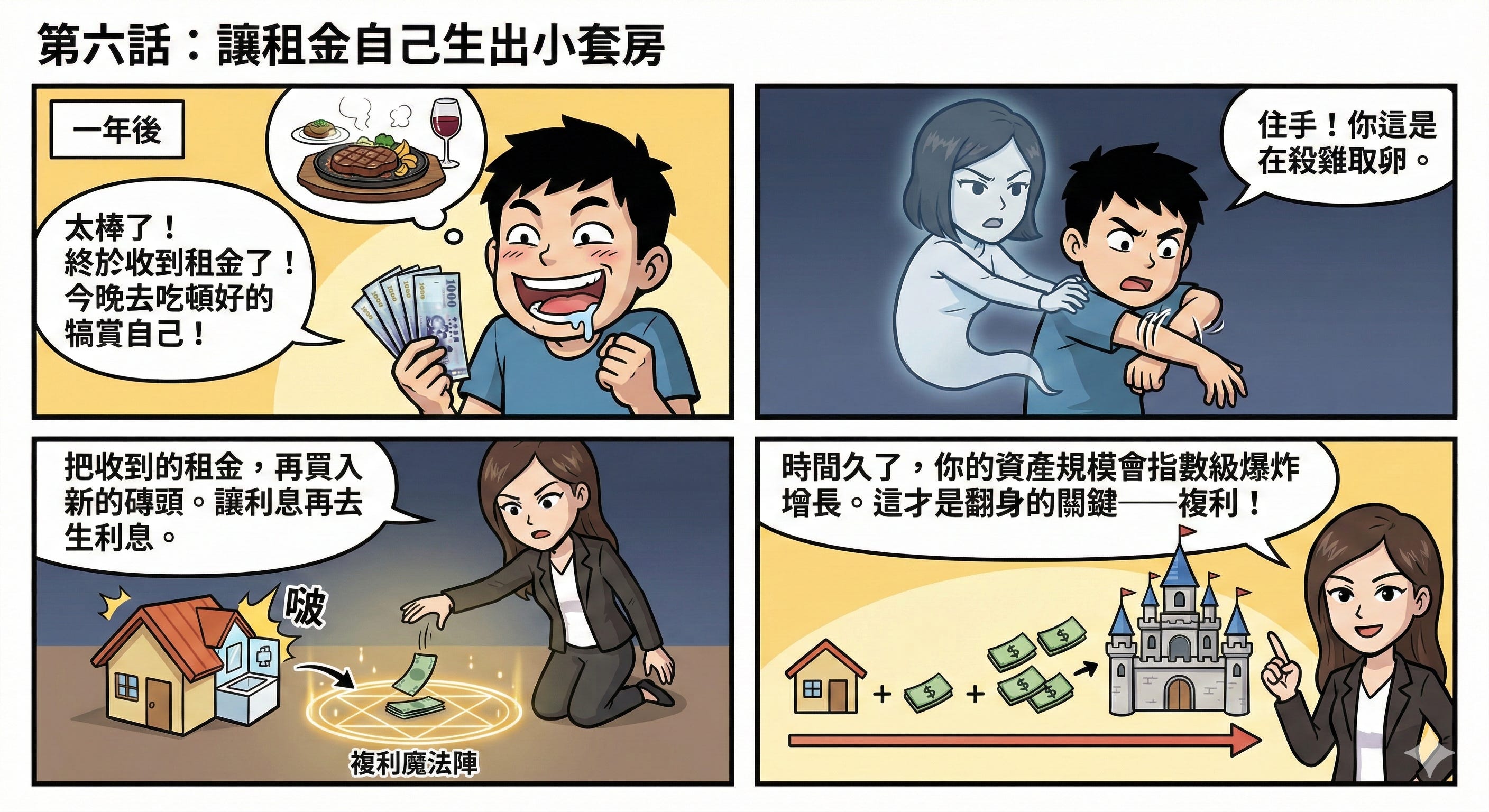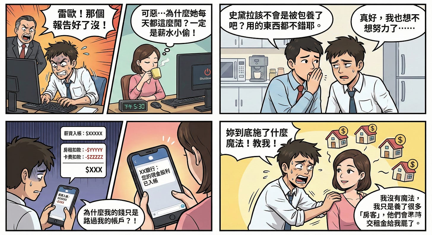 投資觀念四格漫畫(內容:小資族的買股翻身術/AI生成)