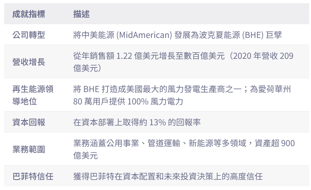 雖然阿貝爾不像巴菲特或其投資副手那樣直接管理波克夏龐大的股票投資組合,但他在資本配置和業務管理方面展現了卓越的能力,尤其是在波克夏能源 (BHE) 的成就上。