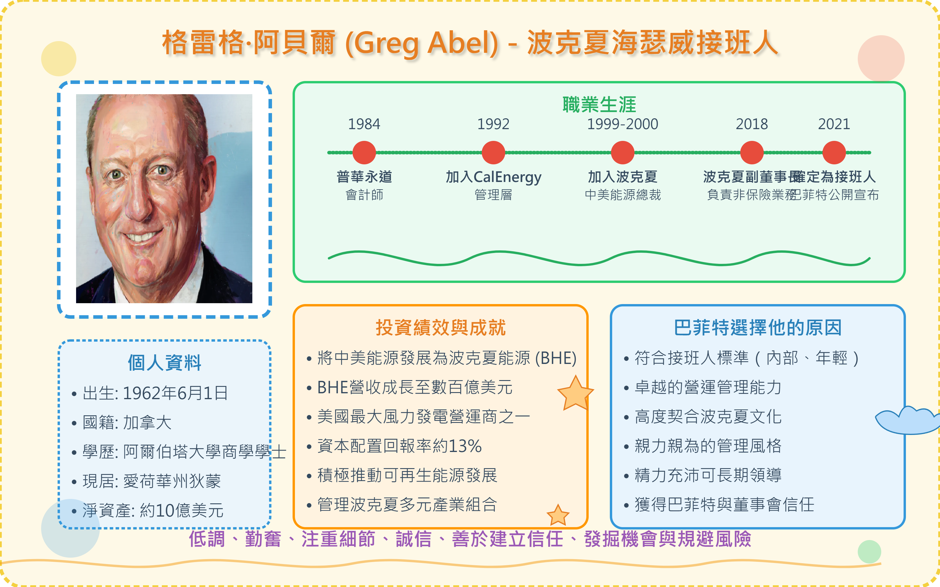 阿貝爾出生於加拿大,擁有會計背景,在能源領域累積了豐富的經驗與卓越的管理績效,特別是在領導波克夏能源公司 (BHE) 轉型為能源巨擘方面表現突出。